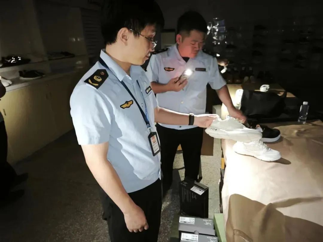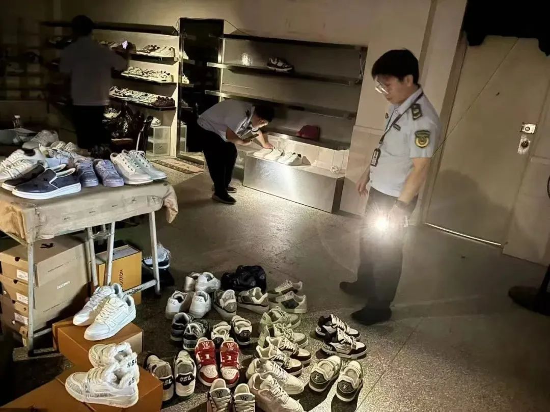 该校园原属一所职业学院,自2023年搬迁后长期空置。执法人员抵达现场后发现,该校园已被某物业承包,计划改造为创意园。尽管教学楼主体结构未改,但部分教室已被改造为展厅。透过玻璃门窗,执法人员发现其中的4个展厅内堆放的手提包、运动鞋等商品显著印有“LV”“GUCCI”等品牌标识。
