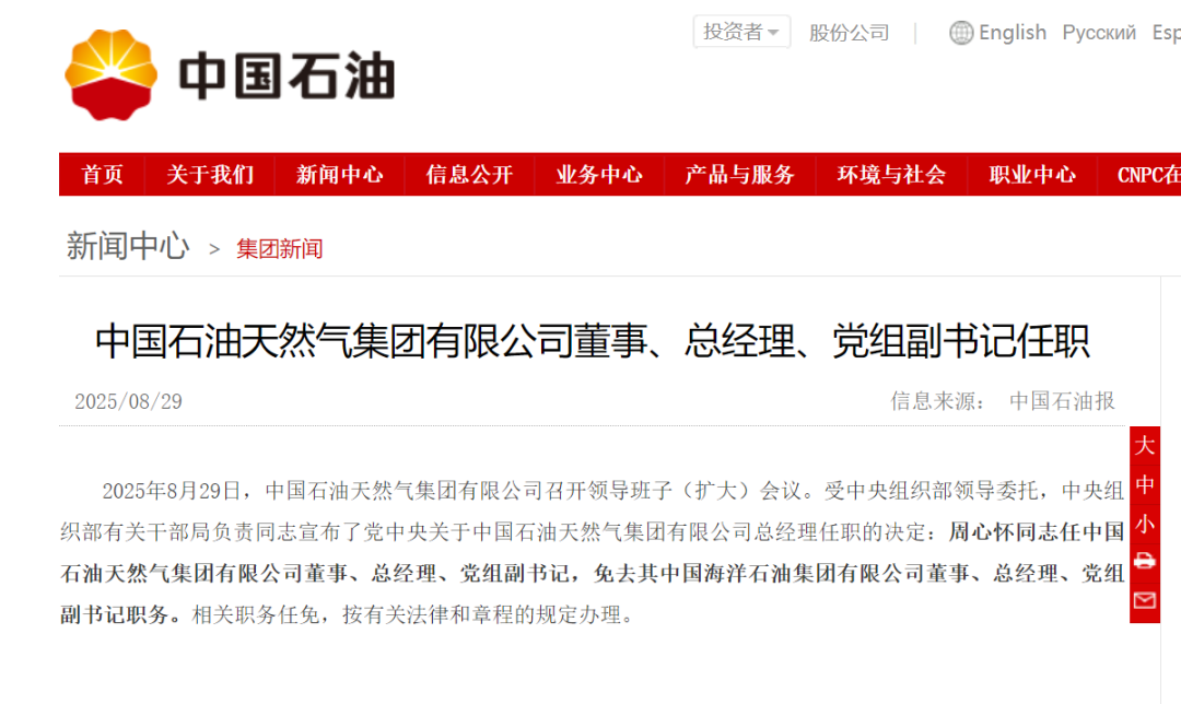 2025年8月29日,中国石油天然气集团有限公司召开领导班子(扩大)会议。受中央组织部领导委托,中央组织部有关干部局负责同志宣布了党中央关于中国石油天然气集团有限公司总经理任职的决定:周心怀同志任中国石油天然气集团有限公司董事、总经理、党组副书记,免去其中国海洋石油集团有限公司董事、总经理、党组副书记职务。相关职务任免,按有关法律和章程的规定办理。