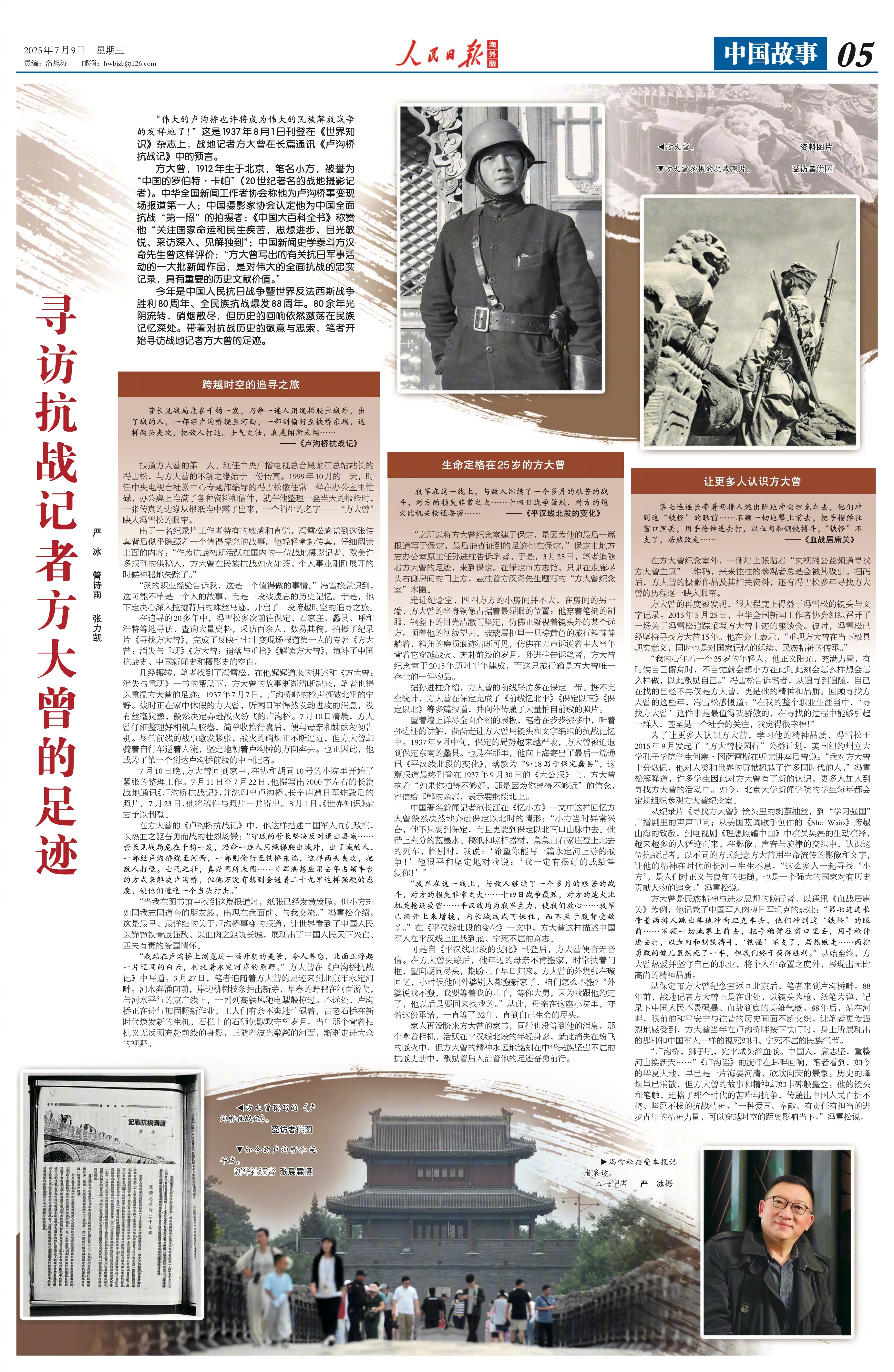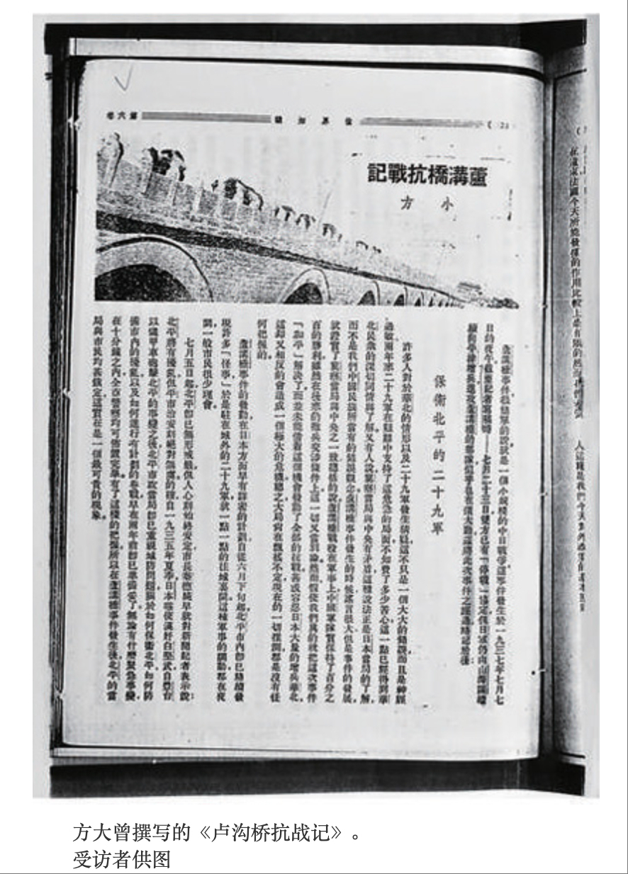 随后,他撰写出7000字左右的长篇战地通讯《卢沟桥抗战记》,并洗印出卢沟桥、长辛店遭日军炸毁后的照片。这是最早、最详细的关于卢沟桥事变的报道。他就是方大曾,中华全国新闻工作者协会称他为卢沟桥事变现场报道第一人,中国摄影家协会认定他为中国全面抗战“第一照”的拍摄者。